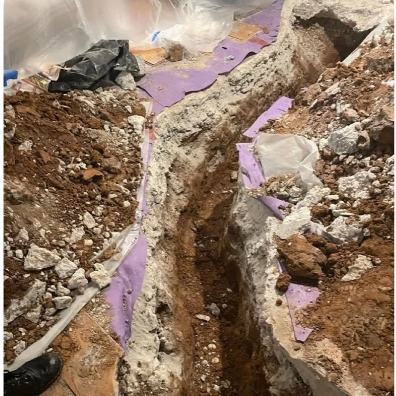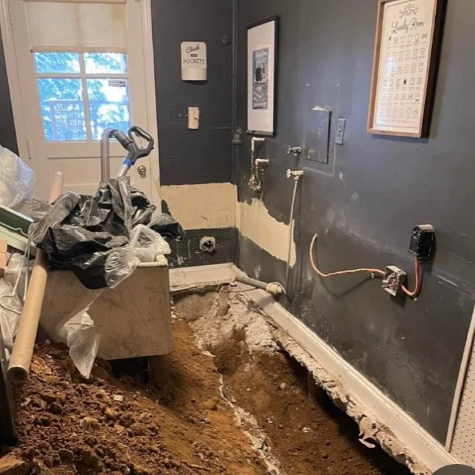 Friends have been telling me I should do this for at least two decades (that and party planning, because I love a good theme, but Lord have mercy, I can’t bake for crap and it’s very temporary…I prefer doing the stuff that lasts. My husband finally said, “Hey…so you’re running out of things to renovate in our own house….so” …’please go overturn someone else’s house,’ was the subtext there. In March 2023, the sewer line under our house completely collapsed into itself while we were out of town at a wedding in Miami. My mom and stepdad were watching the kids and mom texted me to say “Hey sweetie, call me when you get a chance?” That’s never good. There was sewage coming up through the basement shower, and none of the toilets would flush. Rotorooter came out and diagnosed the problem and flushed things clear enough to keep us working for a week or so, and then we flew home (all relaxation GONE!) got quotes, and within a week we were $27,000 poorer with a giant Grand Canyon in our front yard and a jackhammered basement.